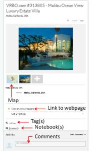 The beauty in using Springpad is that you can see the corresponding photo on the page (a photo of the house of a particular listing). The photo shows up as an icon when you show multiple Spring items on a list or a full photo when you’re open up the Spring item. The Spring item also shows a map of the location. You can click on the web address in the item to navigate to the page. There is also an opportunity for users of the notebook (private) to comment. This feature is particularly helpful for multiple reasons. My fiancée copied and pasted the message he sent to a owner of a listing so that I can use the same message when I emailed owners of the listings I found. We also use the comment feature to take notes on a particular listing (for example, when I saw the outdoor sauna of a house I like, I immediately thought of converting that into a photobooth!).