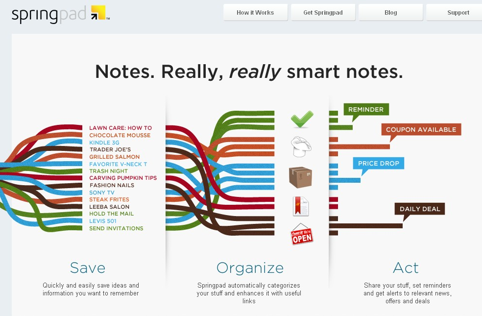 A video delineating Springpad’s features (suggestions (books and restaurants) from friends and sharing ideas in a project (redecorations) is here. You can find innovative ways of using Springpad at this blog and also at the Springpad official blog, particularly the “Using Springpad” category.